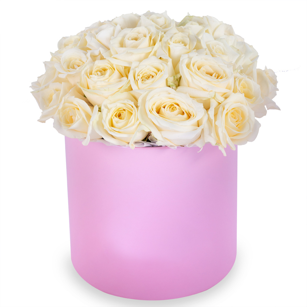 Букет из 35 белых роз premium в розовой шляпной коробке