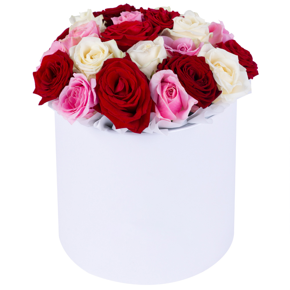 Букет из 21 разноцветной розы premium в белой шляпной коробке
