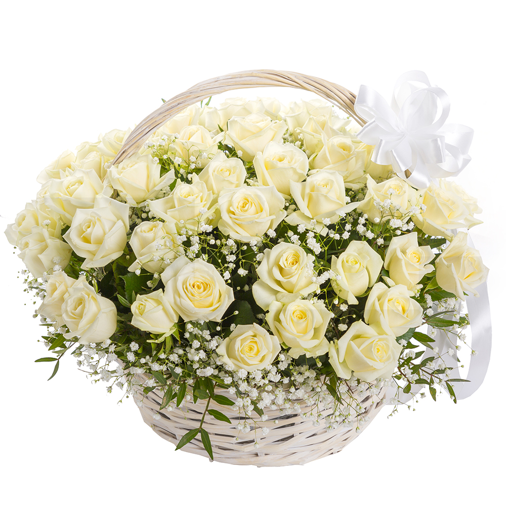 51 белая роза в корзине с гипсофилой