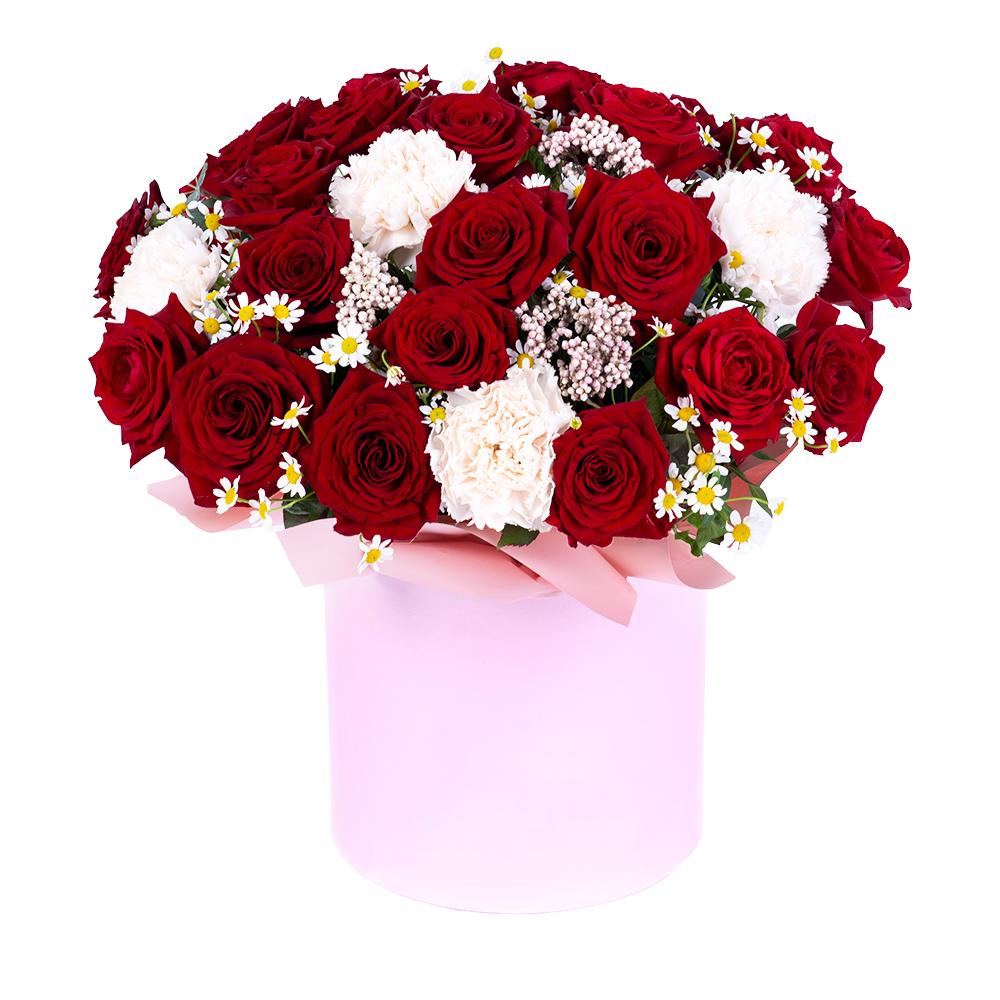 Шляпная коробка из роз и гвоздик