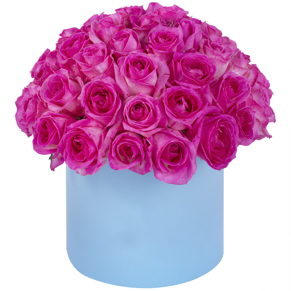 Букет из 51 малиновой розы premium в голубой шляпной коробке