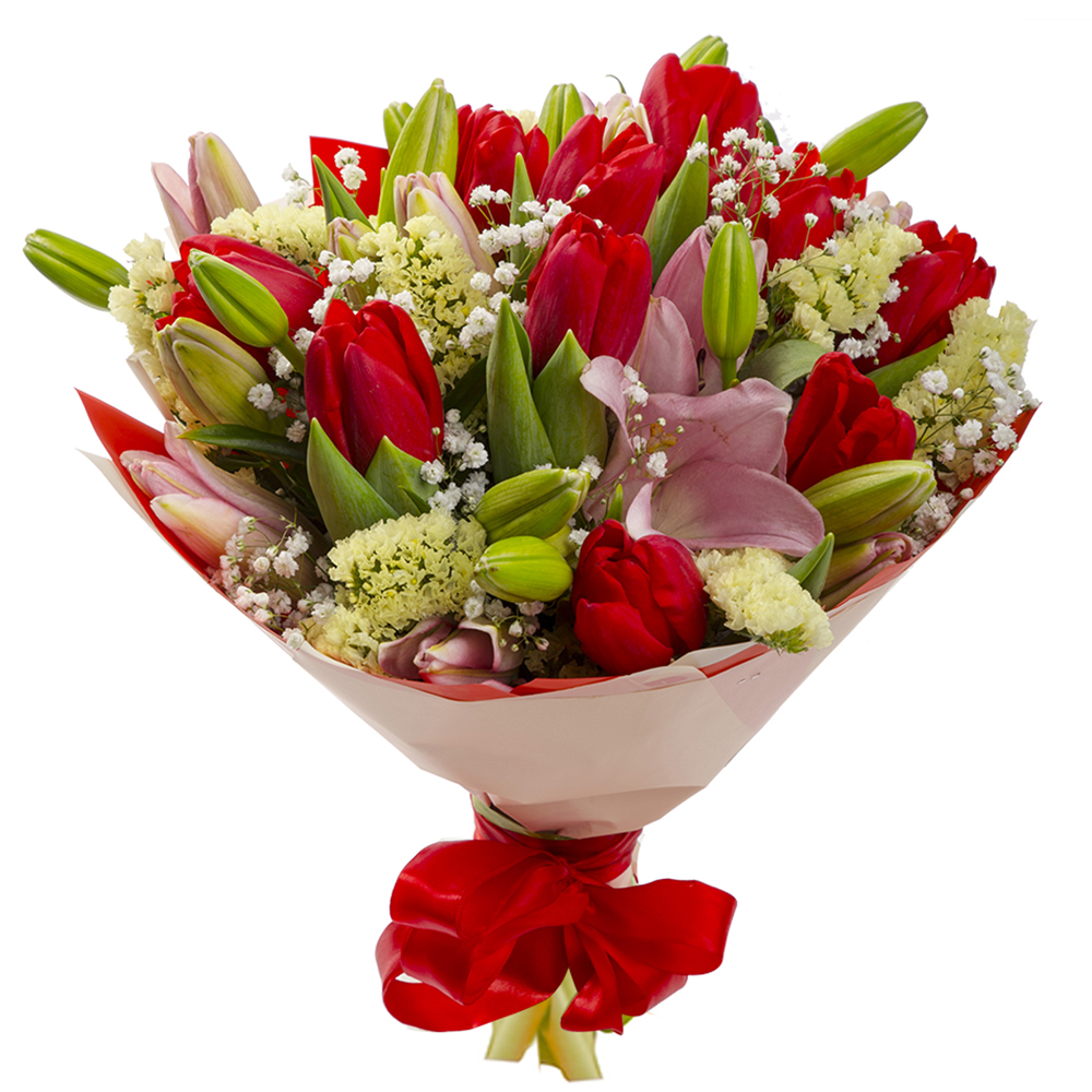 Букет из красных тюльпанов и лилий