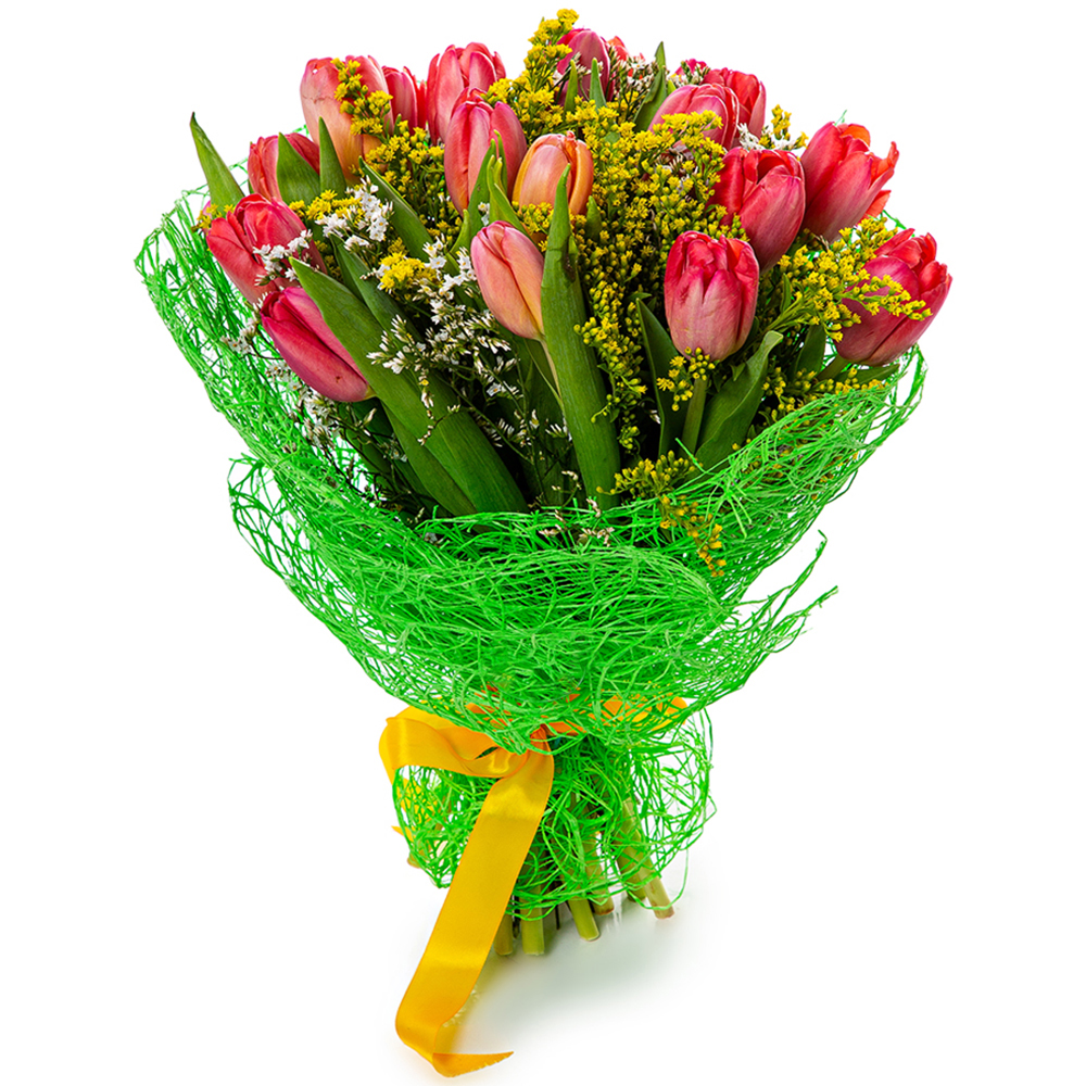Букет из тюльпанов, солидаго и лимониума