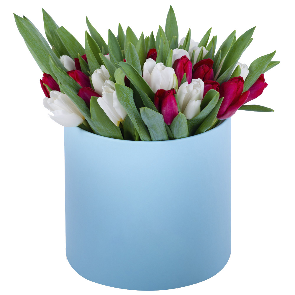51 Разноцветный тюльпан в голубой шляпной коробке