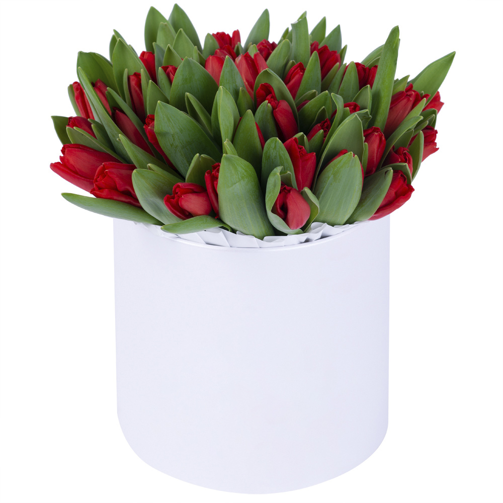 51 красный тюльпан в белой шляпной коробке