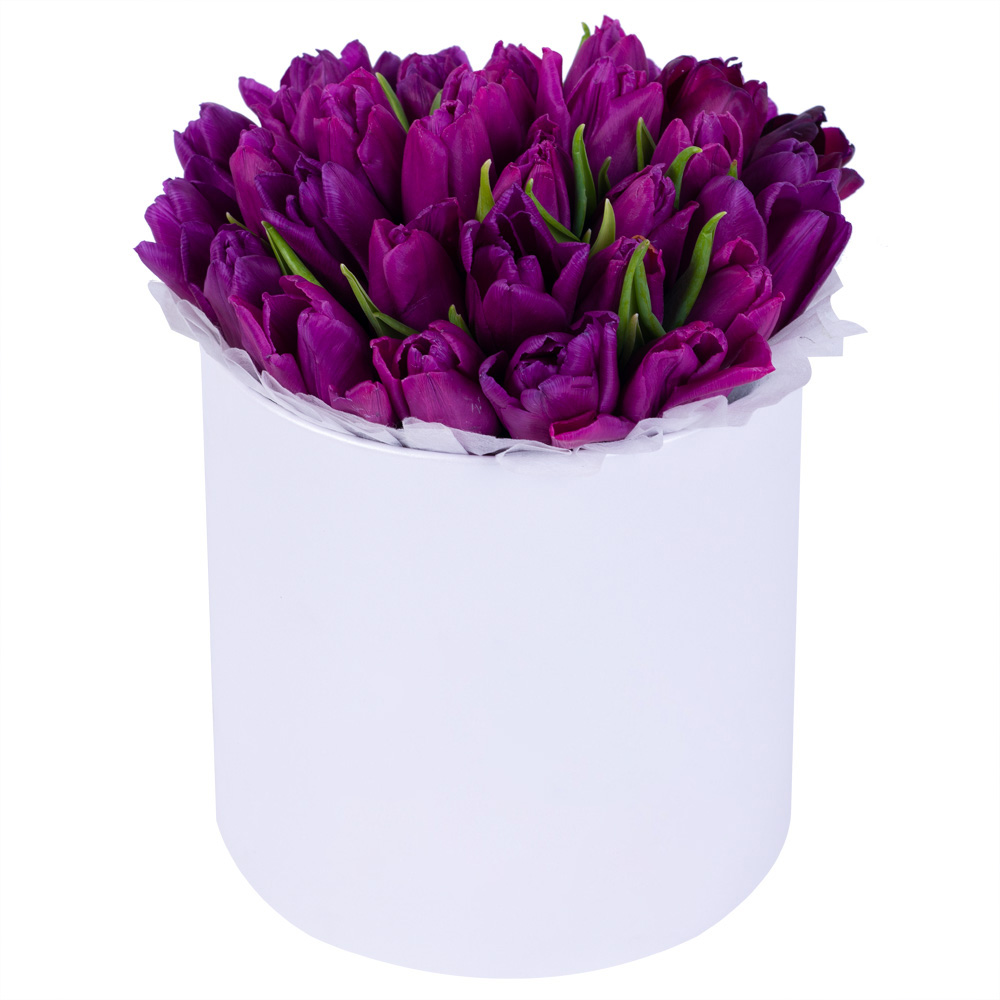35 фиолетовых тюльпан в белой шляпной коробке