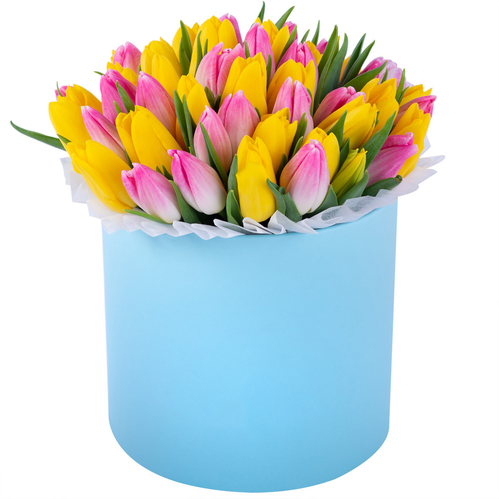 51 разноцветных тюльпан в голубой шляпной коробке