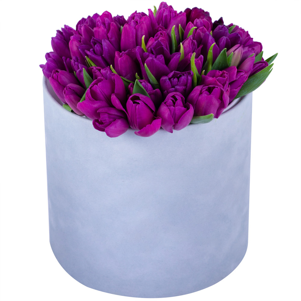 51 фиолетовый тюльпан в серой бархатной шляпной коробке