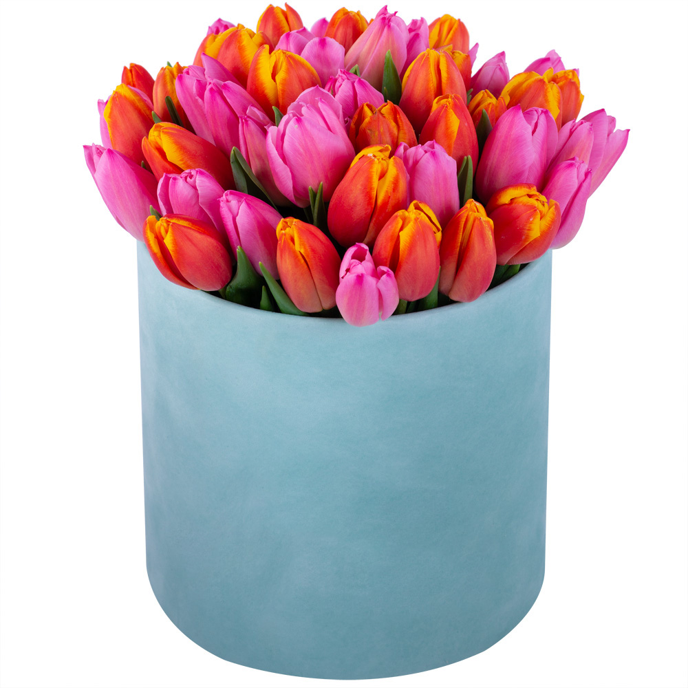 Букет микс из 51 тюльпана в зеленой бархатной шляпной коробке
