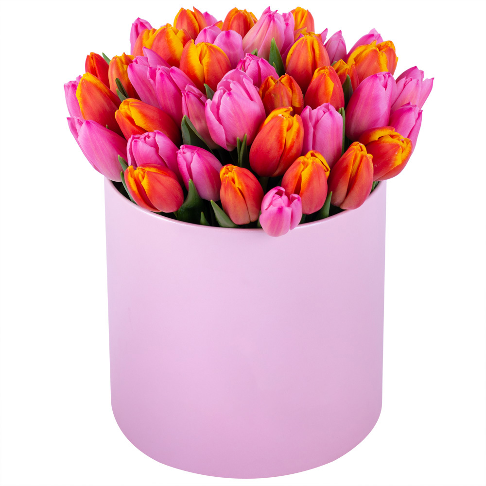 Букет микс из 51 тюльпана в роовой шляпной коробке