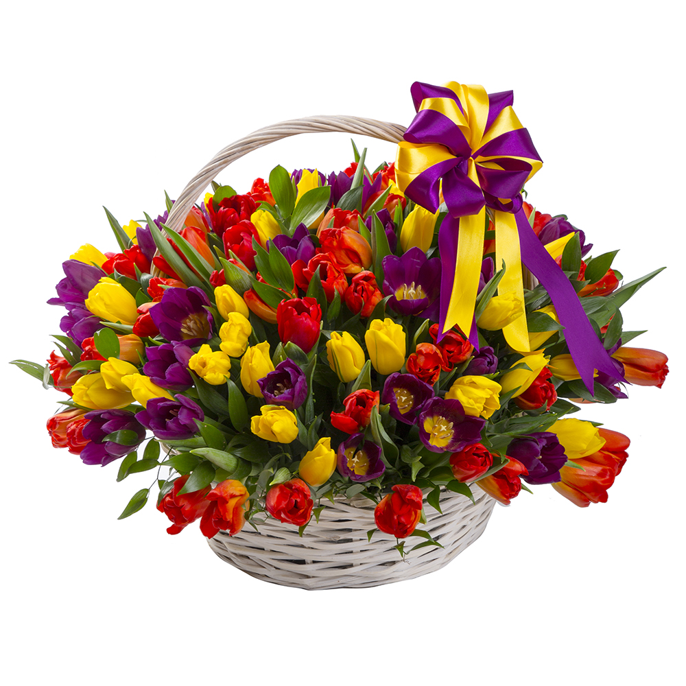 101 разноцветный тюльпан в корзине