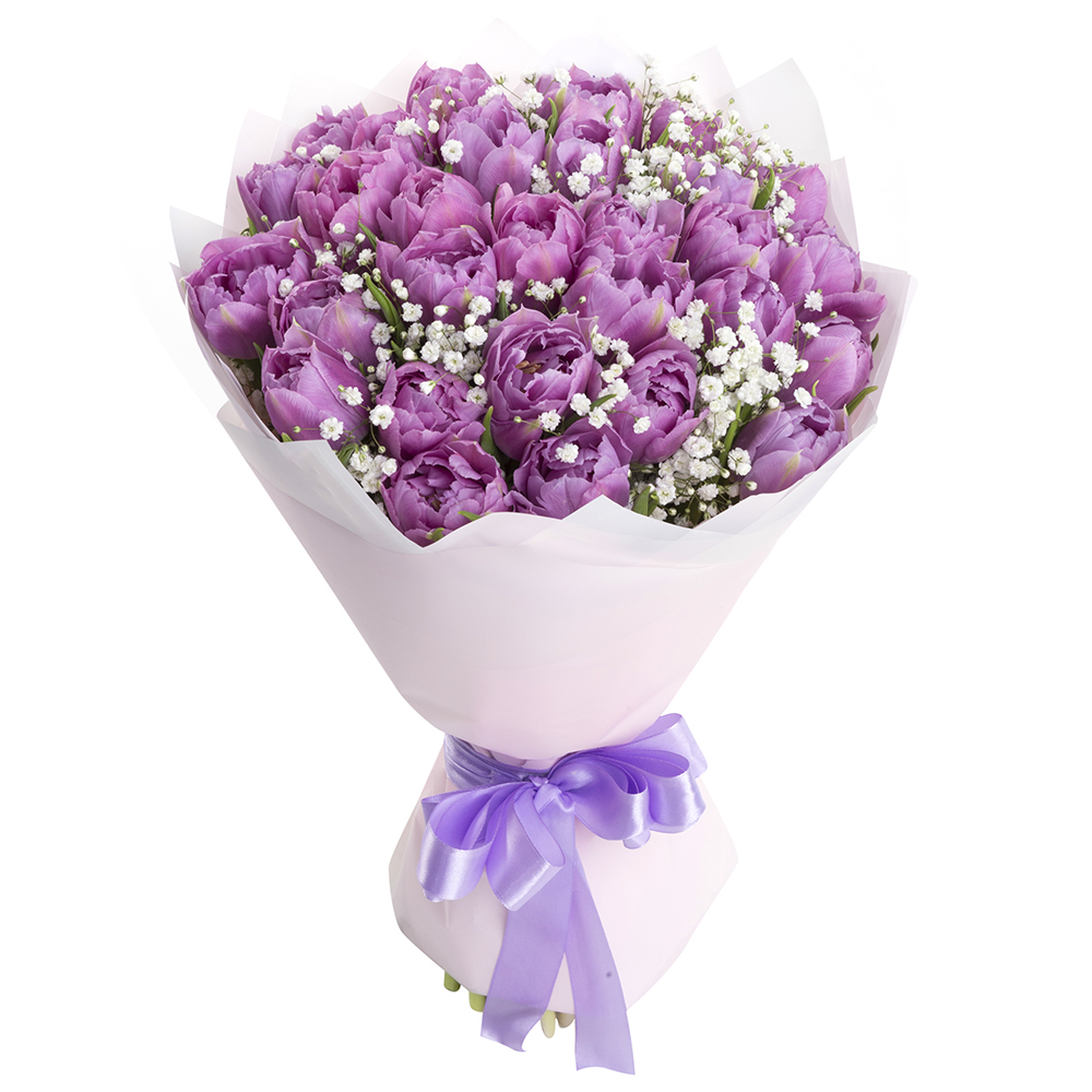 29 фиолетовых тюльпанов с гипсофилой