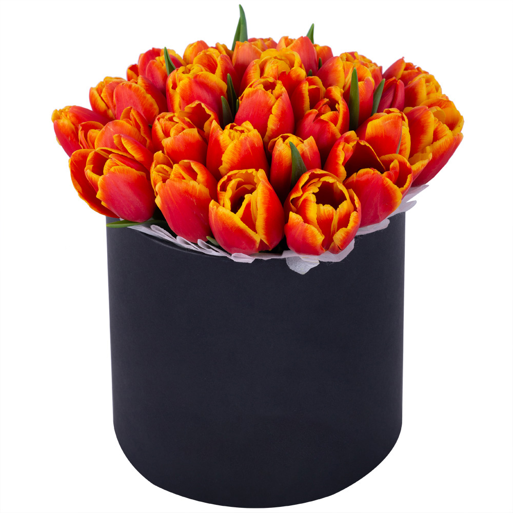 35 огненных тюльпан в черной шляпной коробке