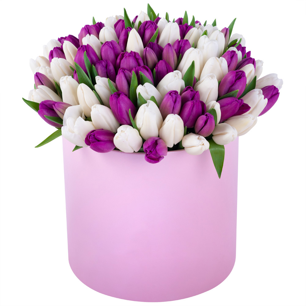 101 разноцветный тюльпан в розовой шляпной коробке