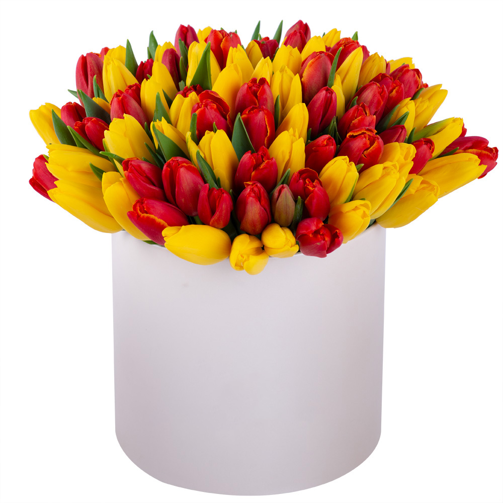 101 разноцветный тюльпан в шляпной кремовой коробке